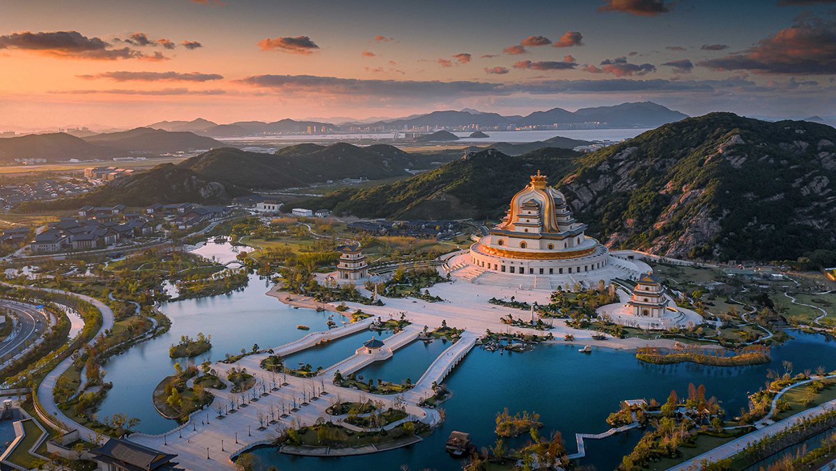 觀音法界項(xiàng)目位于浙江省舟山市 , 實(shí)施面積 76.7 公頃,包括正法講寺、居士村、觀音圣壇及觀音公園三個(gè)功能組團(tuán)。項(xiàng)目以“舉世無雙 ,流芳百世”為建設(shè)目標(biāo),是一處以觀音文化為主題的博覽園,總體形成海天佛國(guó)、莊嚴(yán)凈土的基調(diào),園區(qū)內(nèi)正法講寺風(fēng)格參照宋式佛教寺院形制 , 是國(guó)內(nèi)規(guī)模最大尼眾叢林之一,居士村為參照明清江南村落布局的適合居士短期修行的主題社區(qū),觀音公園及圣壇為集中展示觀音文化的殿堂。