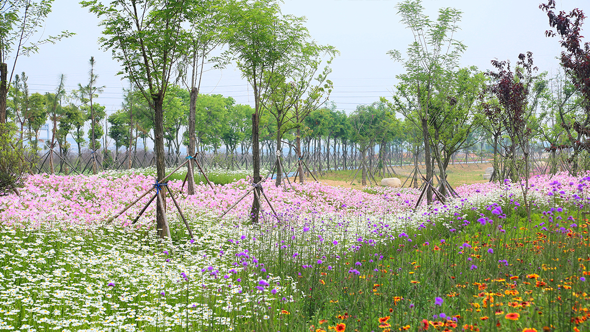 設計從五大方面切入:1、區域道路整體考慮,擴展到對整個松航路的規劃與定位,松航北路(花林泛海岸)——松航中路 (野逸滿綠廊 )——松航南路 ( 海島綴城中 ),突顯道路個性;2、統一空間形態,曲線式路徑貫穿全區,島狀式植物布局加強特征感,入口節點加強特征性;3、以安全慢行優先考慮,減少功能植入,還原道路綠化設計的交通性、形象性、防護性本質;4、生態與景觀結合,通過地形、植物、海綿構造一體化設計,打造生態海綿樣板;5、減少造價投入,植物品種的選擇更當地化、地形造坡更合理化、減少未來養護成本。