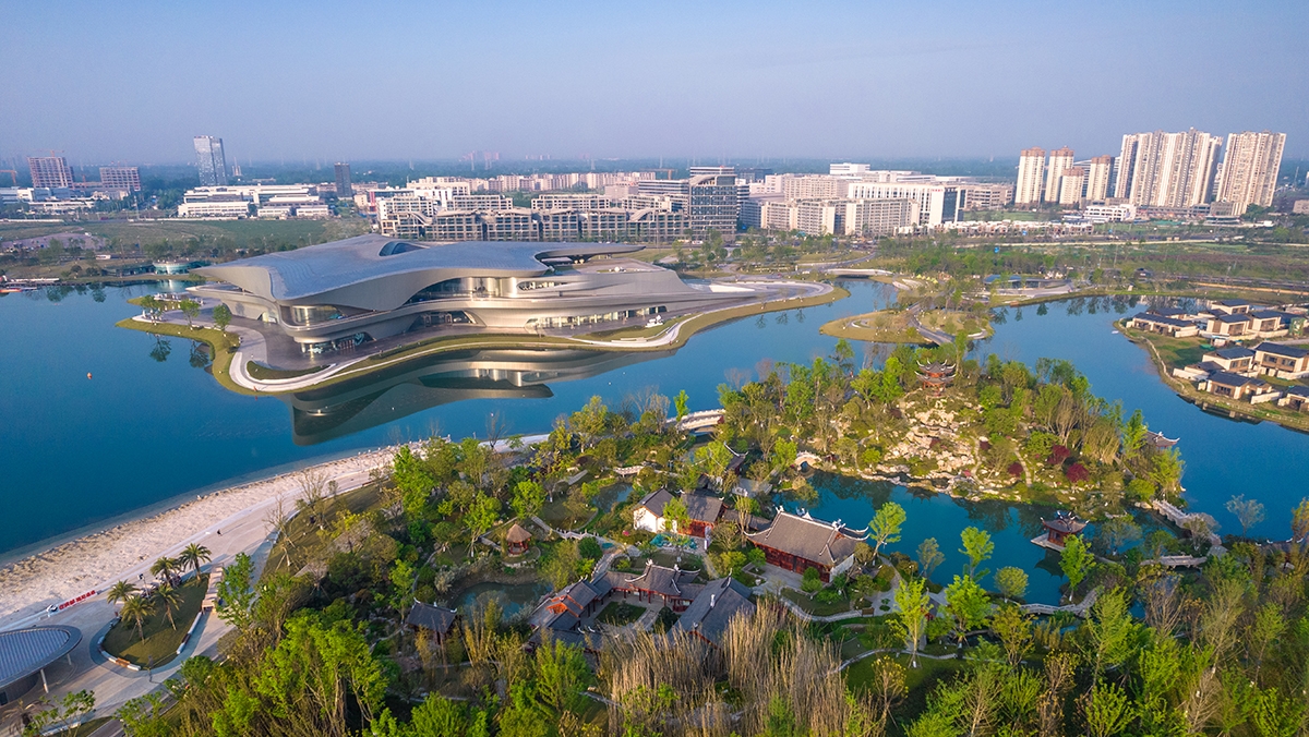 世界科幻公園位于成都市郫都區科創新城,以現有的菁蓉湖公園區域和清水河公園南岸為基礎,向西擴展。設計團隊基于場地現狀、上位規劃和使用需求,提出“以復層山水空間為基底、以蜀都文化為內涵、突出‘科幻’主題的開放型城市綜合公園”的設計目標,深入研究科幻元素表達、文化結合等需求,并將自身經驗與實際案例相結合,運用于公園設計之中。