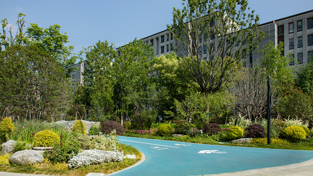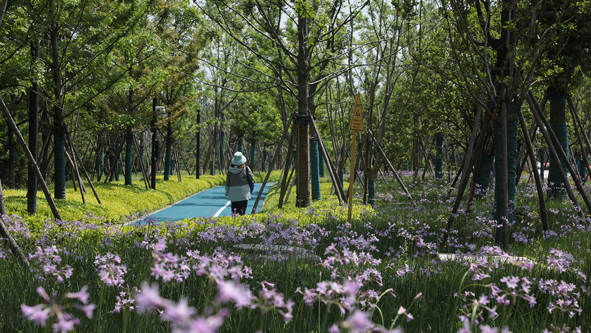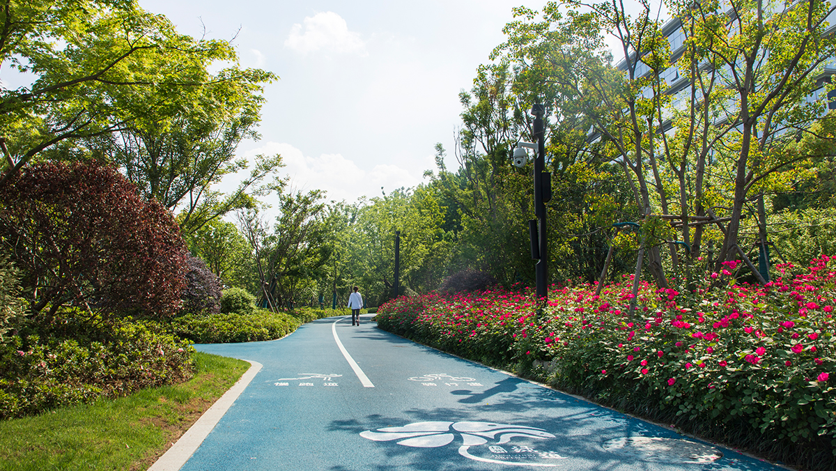 “雙脈”為兩側綠帶中全線貫通、聯系功能地塊的兩條多彩慢道,設計以“輕構建重體驗”為設計原則,打造“智行綠道”和“智慧魔方”服務系統。“智行綠道”總體以1.5米寬步行慢跑綜合道和2米寬騎行道合并布置,局部區段以2米寬慢跑道和2.5米寬騎行道分開布置,時分時合,因地制宜。