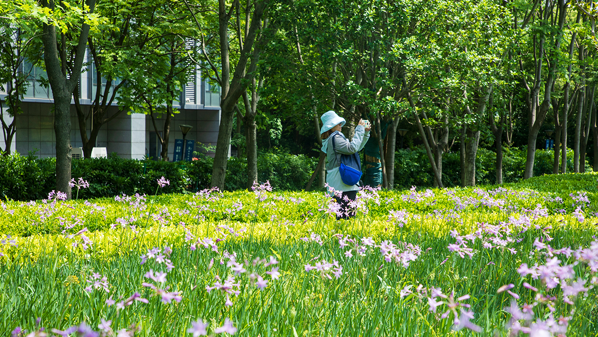 以香樟、樂昌含笑、櫸樹、無患子、沙樸、烏桕、黃山欒樹等冠大蔭濃的喬木品種作為基調,既保證了充足的綠量,又呈現出豐富的季相變化;中層增加大量櫻花、碧桃、紫薇、桂花、木槿、木芙蓉、紅楓、雞爪槭等突出色香宜人的“杭味”林特色;下層則體現魅力花坡的四季爛漫,如菊科花卉、八仙花、蘭花三七、蔥蘭、紫嬌花等生態野趣的草花地被,重要節點及市政路邊大面積種植杜鵑等開花灌木品種,構筑整體層次飽滿、色彩豐富、低碳生態的植物群落。