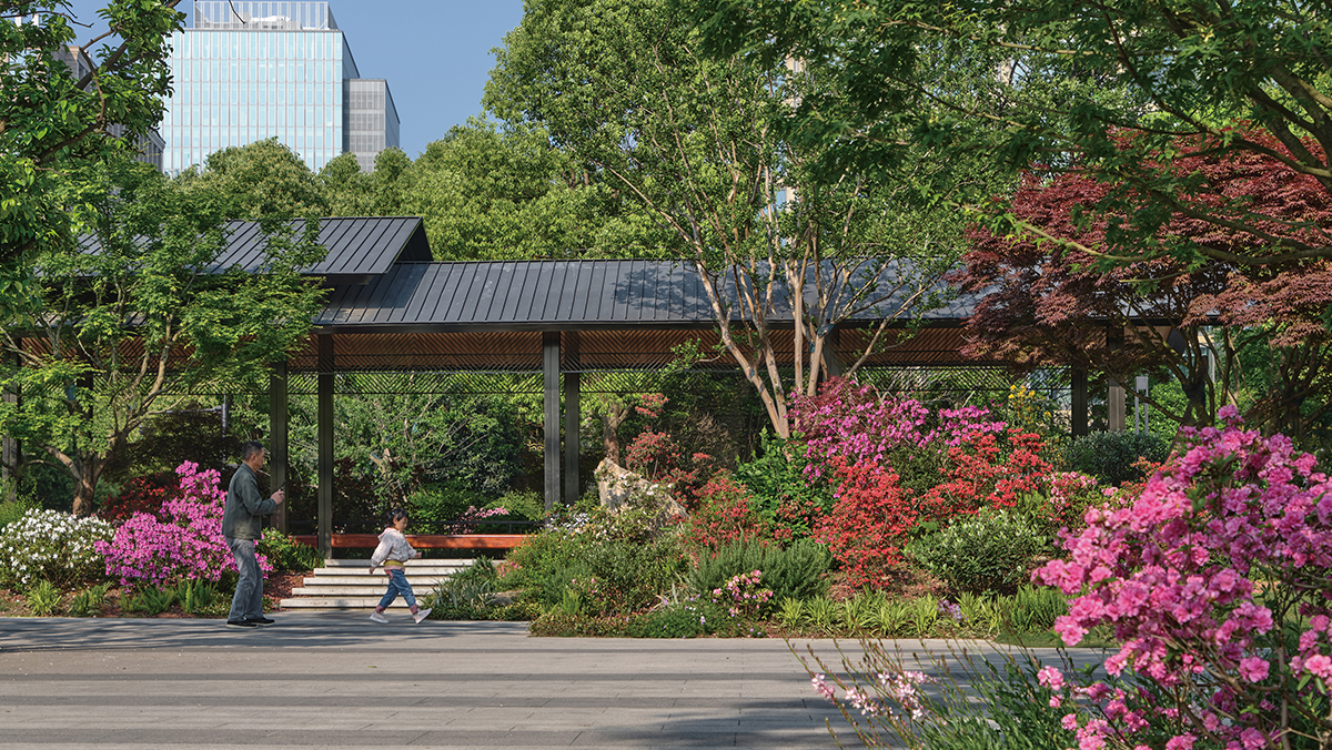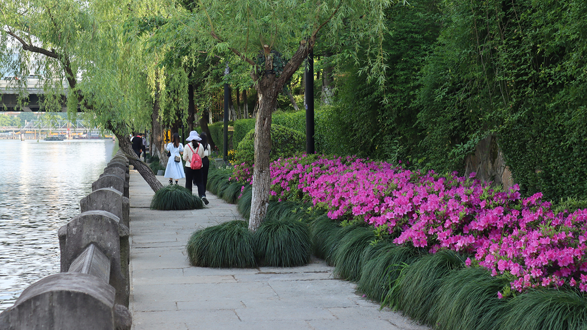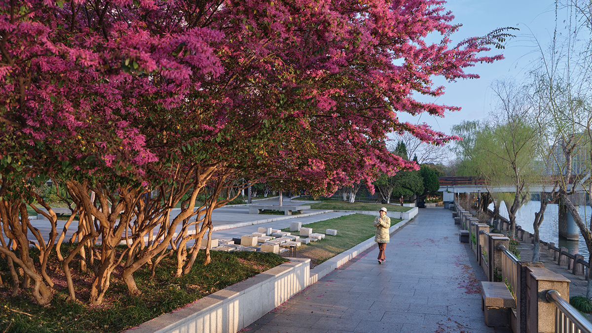 項目整合運河沿線綠地資源,針對性地形成“小河”“武林”兩大景觀環,構建了一系列適宜全齡人群運動健身的戶外場地;提出“疏量增彩”的策略,優化林下空間,打造出“繡球花園”、“鳶尾花園”、“杜鵑花園”等多個主題鮮明的精微花園;采用海綿城市理念,建立雨水花園;深挖沿線文化特質,對文化元素進行解讀與創新呈現;延續原有老石板路,運用傳統工藝確保“修舊如舊”的效果,顯著提升步行體驗;綠道沿線增加與傳統風貌契合的亭廊休憩節點、座椅設置,完善標識系統。