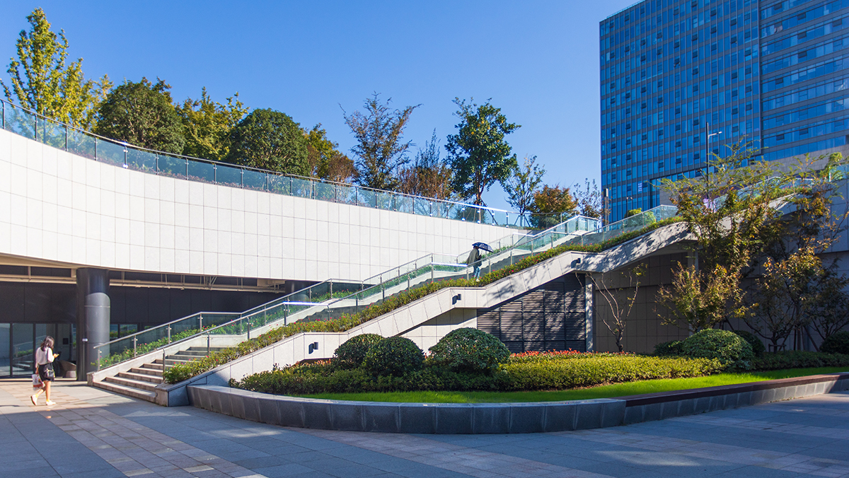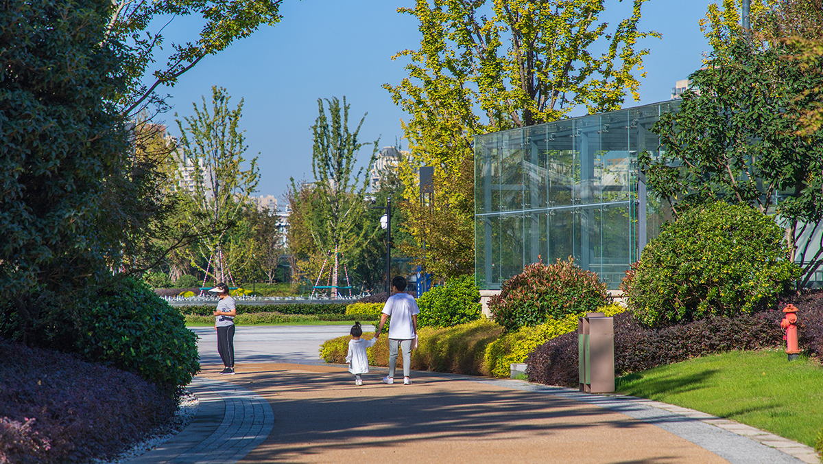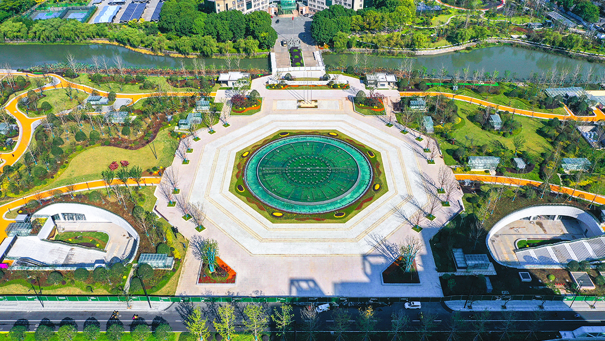 設計以景觀綠化柔化硬質(zhì)界面,打造四季變化的植物景觀,融入文化雕塑,北端設置"錢江潮"景墻展現(xiàn)地域特色,創(chuàng)新采用雨水回收系統(tǒng)為音樂噴泉供水,結(jié)合燈光打造活力夜秀場,并運用無土垂直綠化技術(shù)營造下沉廣場"山水蕭山"迎賓空間。