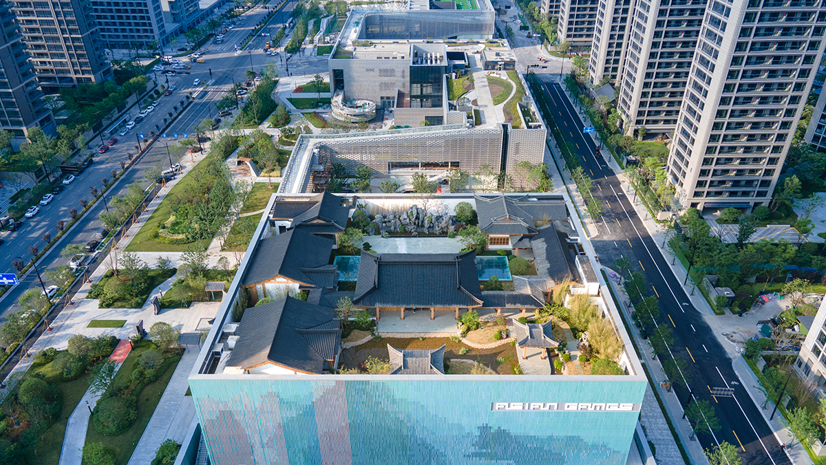 杭州亞運村村長院位于杭州市蕭山區亞運村國際區濱水北區塊1號樓屋頂。項目以“杭州特色、國際風范、亞運文化”為出發點,打造“亞運會第一文化會客廳”。村長院屋頂花園總面積2998.8平方米,采用“前庭后院、背山面水”的布局方式,建筑面積1141.5平方米,鋪裝面積865.8平方米,水面268.0平方米,綠化723.5平方米,以會時參觀為主要游線,以宋式山水畫論為線索,簡遠疏朗、雅致天然,可游可賞可居。