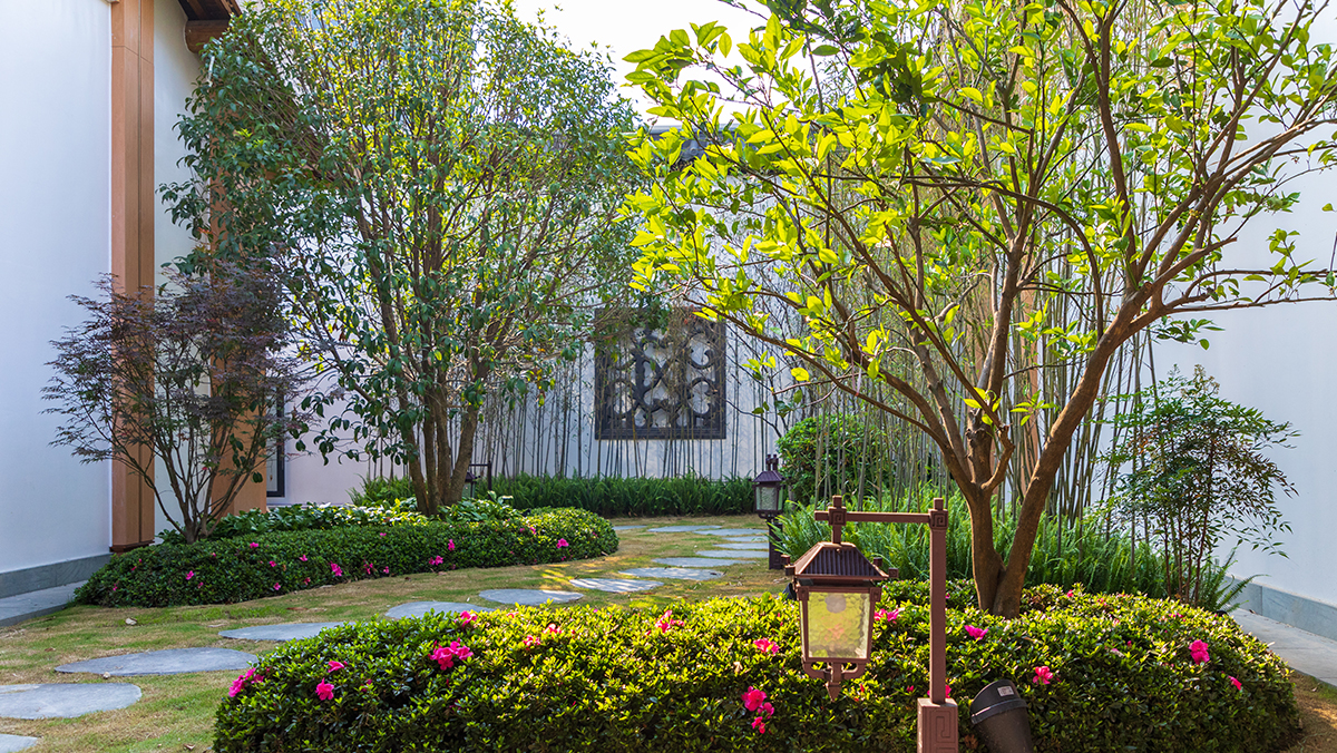 項目廣泛運用屋頂花園相關領域創新技術。利用泡沫混凝土、輕質種植土等材料降低屋面負荷;通過塑石假山表現宋式庭院湖石景致;運用寬幅合成橡膠襯墊膜,在有限覆土厚度條件下保障了屋面淺水景觀的防水效果;并對采光井、樓梯間、排煙井等屋面設施進行景觀美化;通過女兒墻裝飾做法,在保障主體建筑外立面幕墻效果的同時,打造圍合的中式庭院。