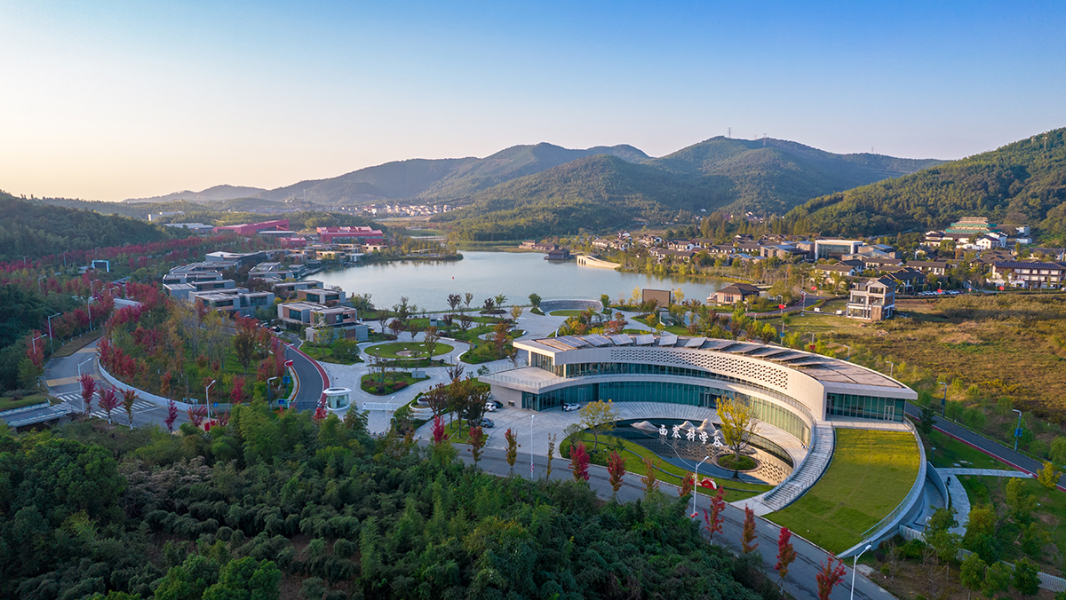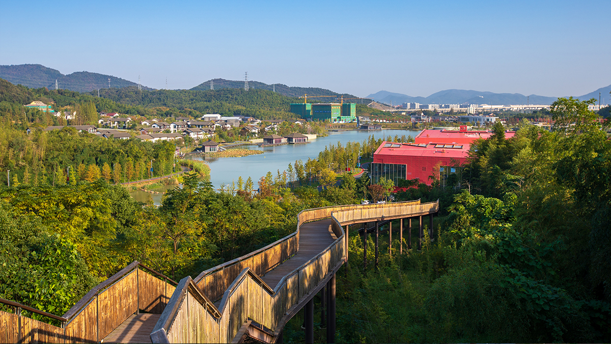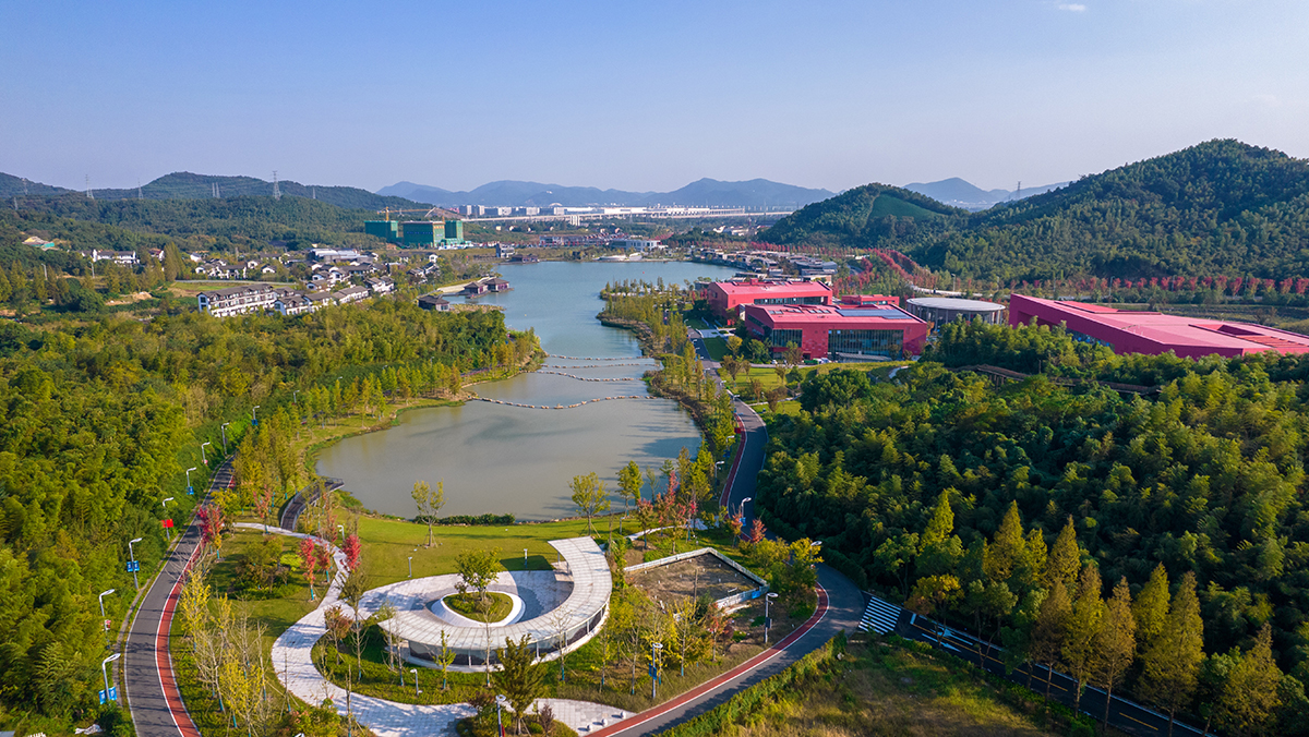 西塞科學谷位于湖州西南,西塞山風景區南麓。園區湖山環抱,林田相擁。南線規劃有現代科研組團,北線臨湖建有酒店、禪寺。環境設計面積約21公頃。