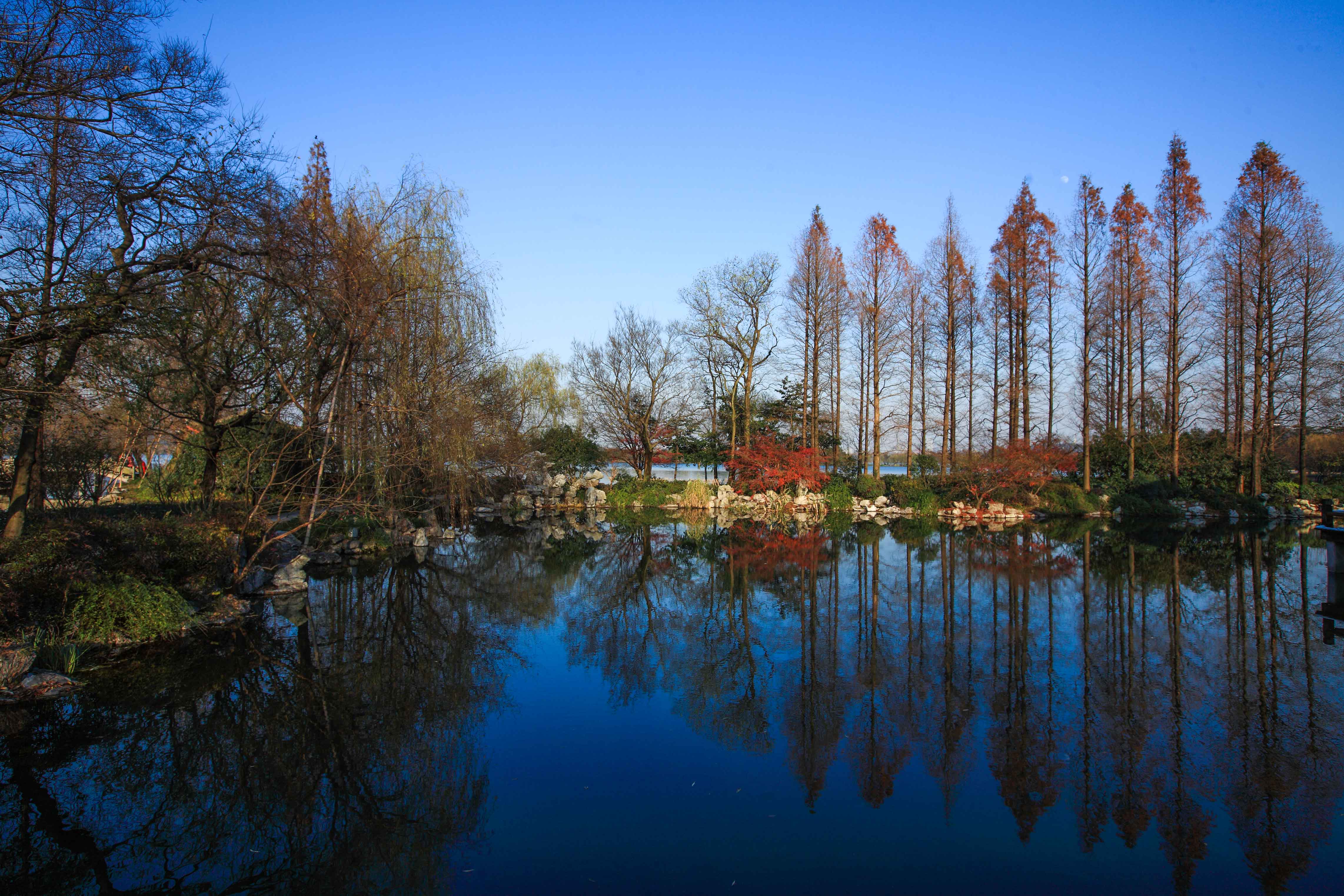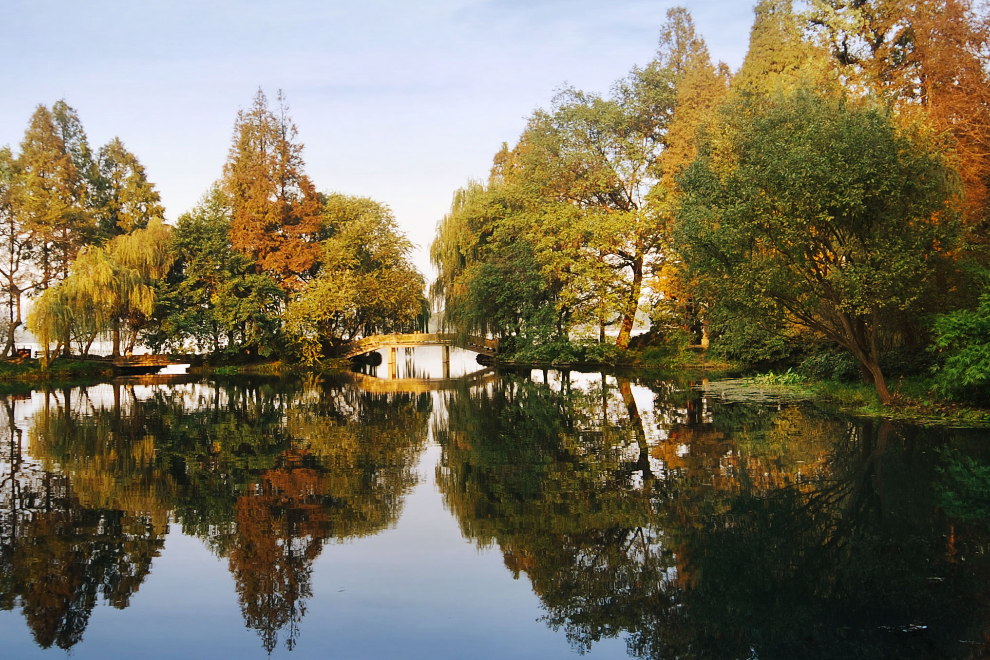 西湖十景之一。西山大麥嶺后的花家山麓,有一條清溪流經此處注入西湖,故稱花港。清康熙南巡時,在蘇堤映波橋和鎖瀾橋之間的定香寺故址上,筑亭建園,砌池養魚,勒石立碑,題下“花港觀魚”四字 。花港觀魚空間開合有致,層次豐富,景觀節奏清晰,既曲折變化,又整體連貫。特別是運用大面積的草坪和以植物為主體的造景組合空間,在發展具有民族特色而又有新時代特點的中國園林中,具有開拓性的作用。