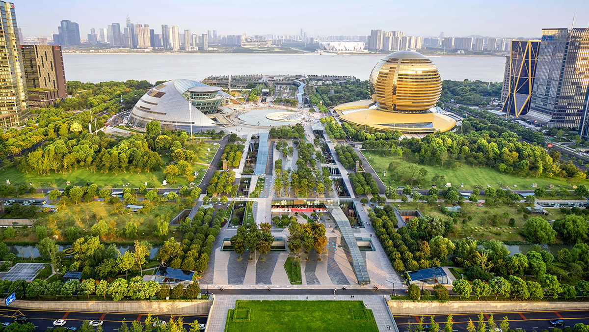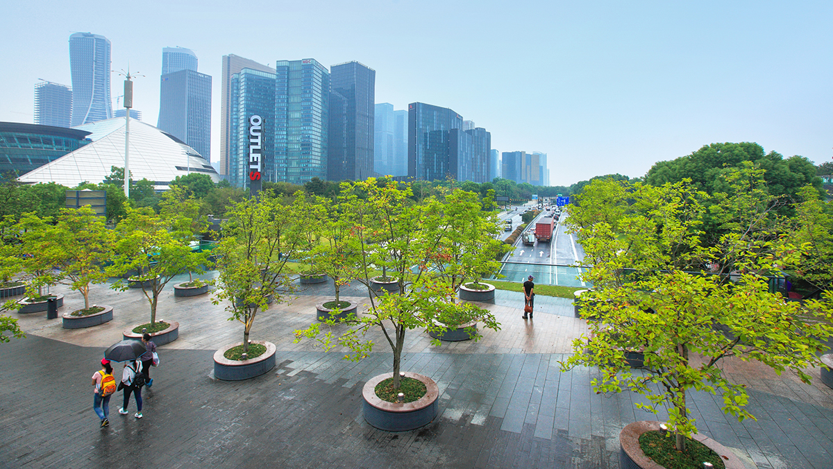 突出“以人文本、綠色生態”的主題,建設綠色新城市的理念,引景入城、引綠入城,堅持綠化的系統性和網絡性,注重商務功能與綠化功能的復合,建筑與景觀的一體,營造詩意般的環境空間。在4平方公里的核心區規劃了“三園、兩帶、一走廊”為主的綠化空間布局,堅持“和而不同”的治理方針,整合道路、河道、隧道、公園、綠化、城市家具、亮燈工程、入城口等核心區各類設計方案,形成核心區綜合整治一體化設計方案,成為杭州的綠色天堂。