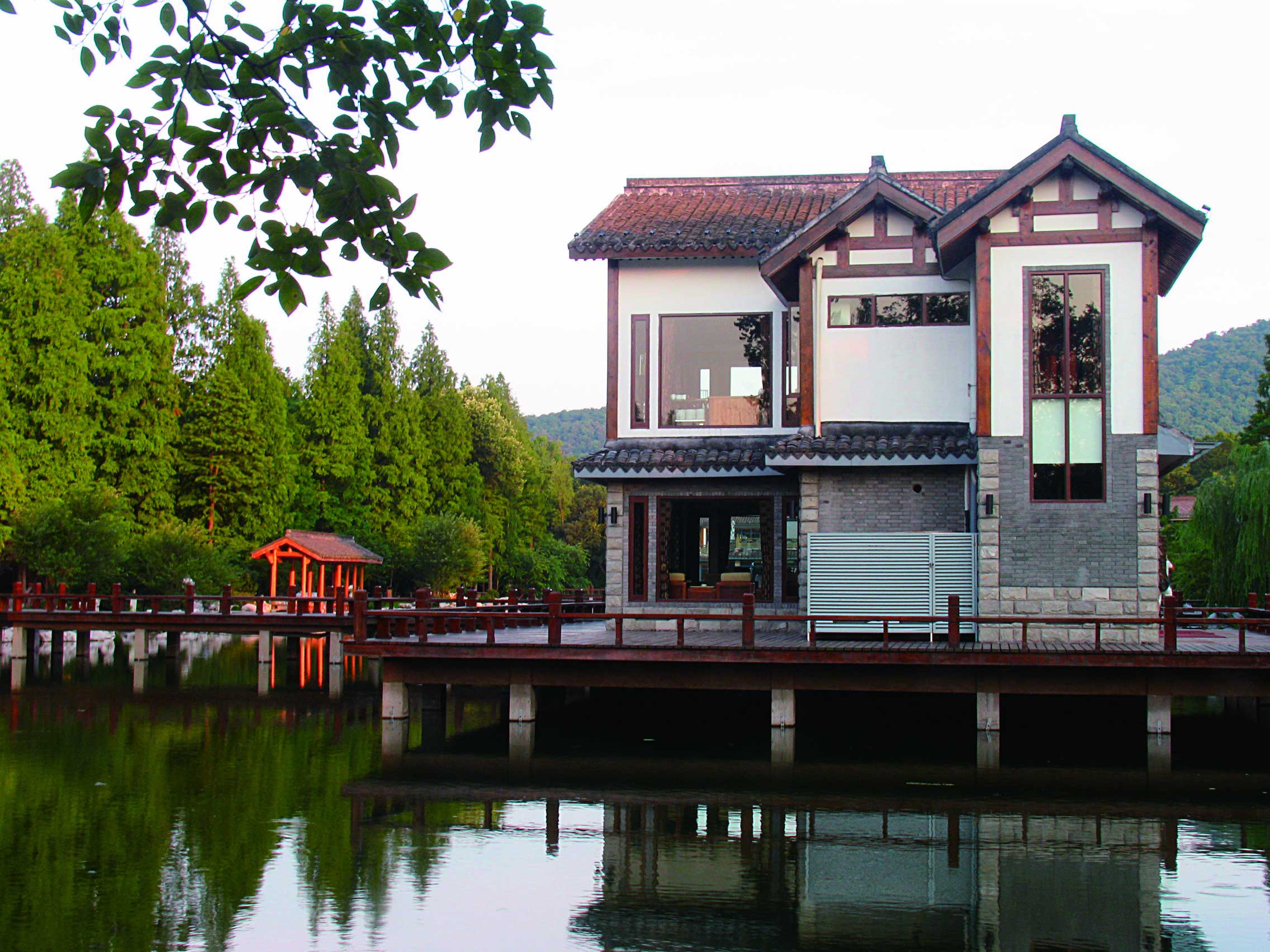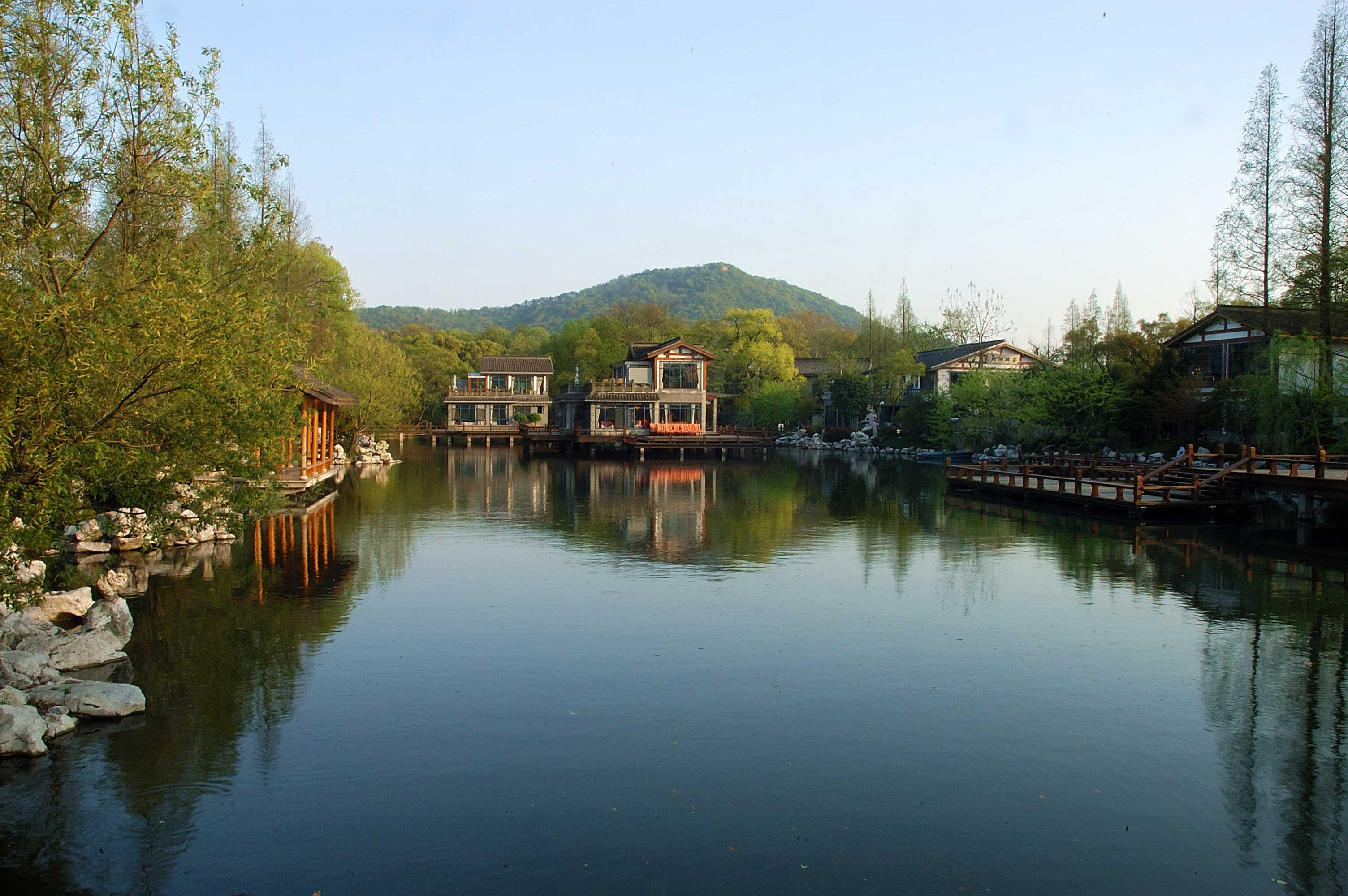 莊內(nèi)植春柳,四圍亭臺環(huán)之。內(nèi)有蓮池,池蓄金魚。園景以春竹、夏荷、秋菊、冬梅出名。莊后小橋,下通湖中,由浚源橋望之,莊南歷歷可見,北可觀隱秀橋,西看三臺來水,玉琴清流,錚淙可聽。園內(nèi)園外互相映襯,湖山秀色一覽在目??上Э谷諔?zhàn)爭杭州淪陷時,莊屋被毀,只?!安厣介w”一處。2003年取原山莊之園林意趣,在楊公堤畔易地恢復(fù)。