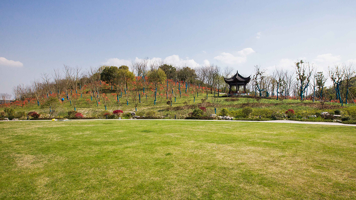 設計立足防洪排澇,改善水環境、水生態,打造自然野趣又富有詩情畫意的郊野公園。通過保留場地的自然元素,構建“一帶、兩山、三區”的空間結構。連通內外水系,打造自然岸線,構建密林、草地、水岸等不同生境,形成區域的生態基底。靈山路貫通公園,形成景觀性的交通通廊,綠地結合水系、游步道,亭廊的設置,并注重植物群體的景觀營造,形成道路兩側花成片、草成坪、樹成蔭的壯闊景觀。