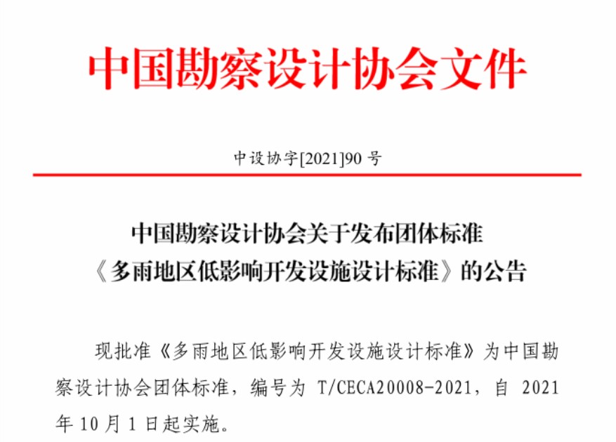 近日,由中國勘察設計協會風景園林與生態環境分會(以下簡稱“分會”)組織編制的中國勘察設計協會團體標準《多雨地區低影響開發設施設計標準》(編號T/CECA20008-2021)已由中國勘察設計協會批準為團體標準并正式發布。標準將于2021年10月1日起實施。